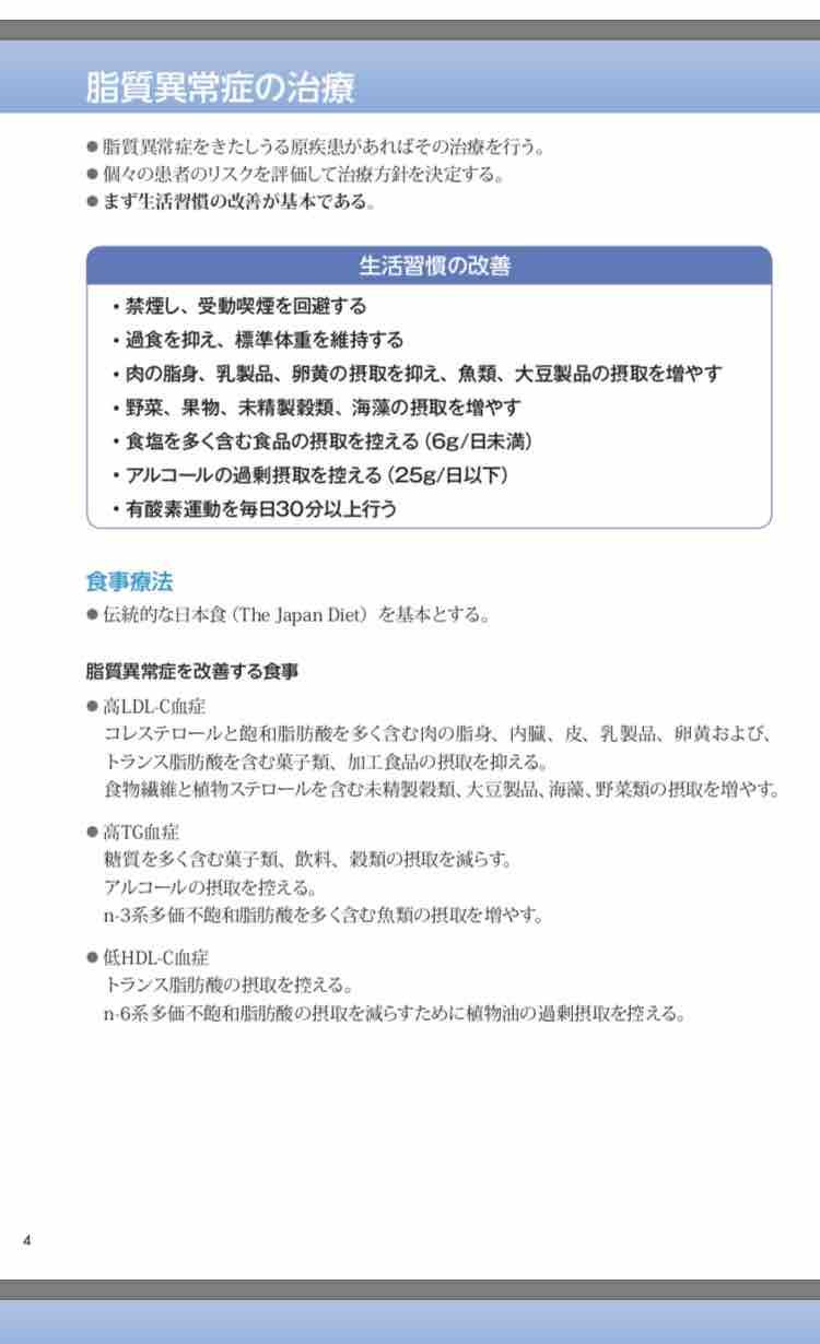 • 肉の脂身・乳製品・卵黄の摂取を控え、魚・大豆製品を増やす。