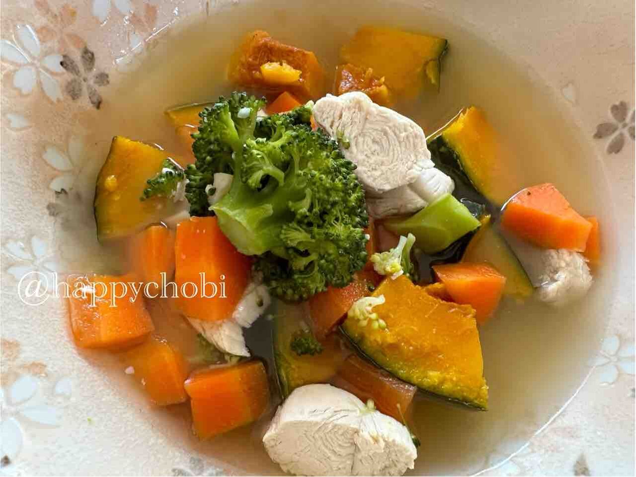 これは家族のダイエットメニュー(温野菜&ササミ)を、息子と私用にスープにしたもの。