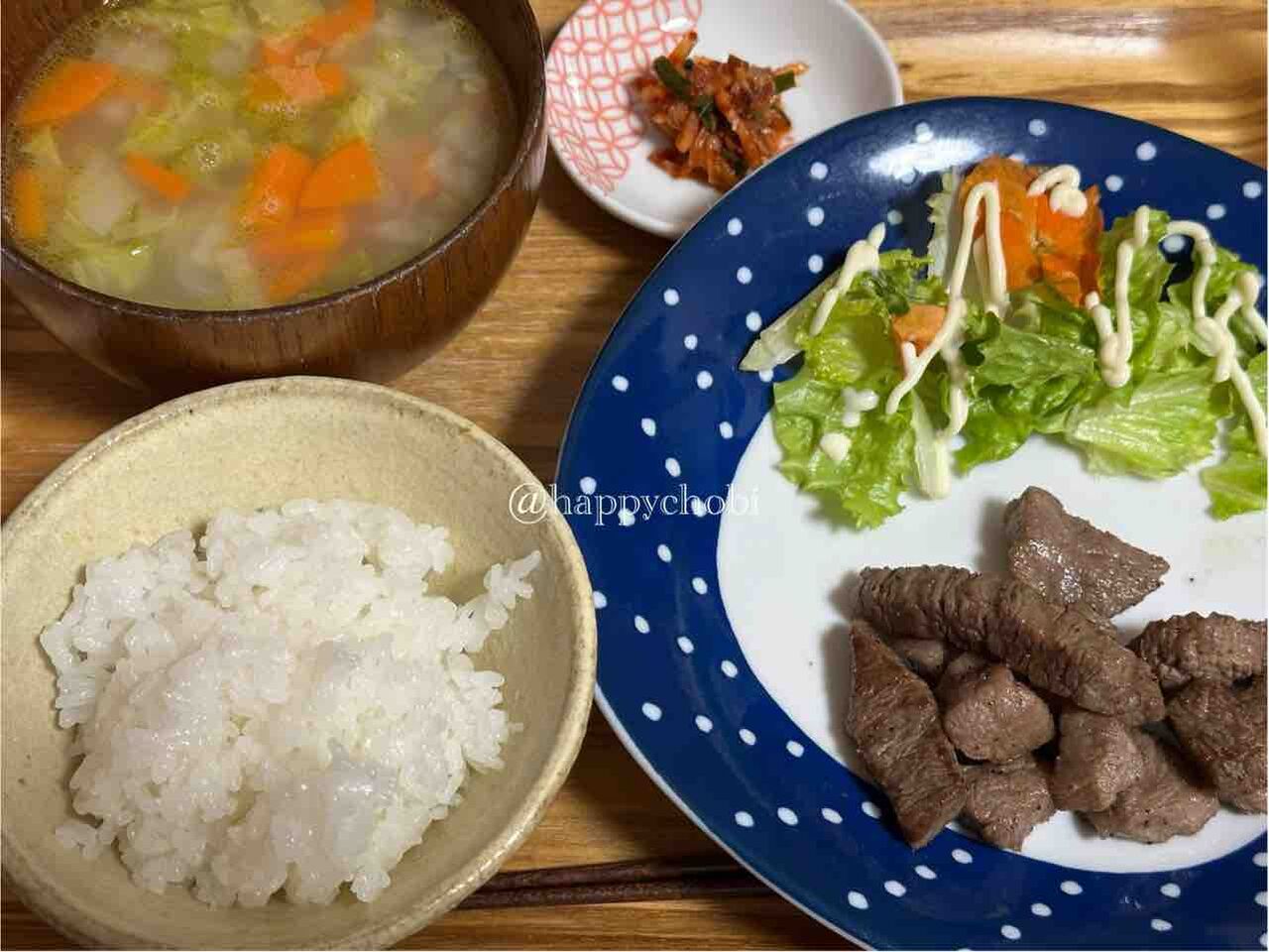 昨日の夕飯。春菊の和え物作ろうとして、市販のキムチに変更してよかった。洗い物減った。