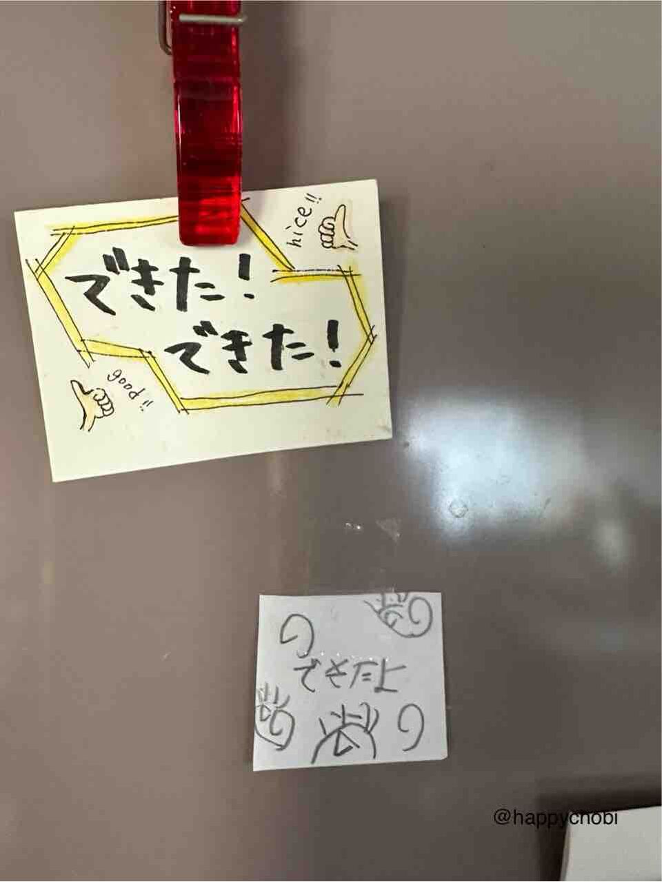 私が描いた「できた! できた!」の下に、息子が「できたよ」って描いて貼ってた。
