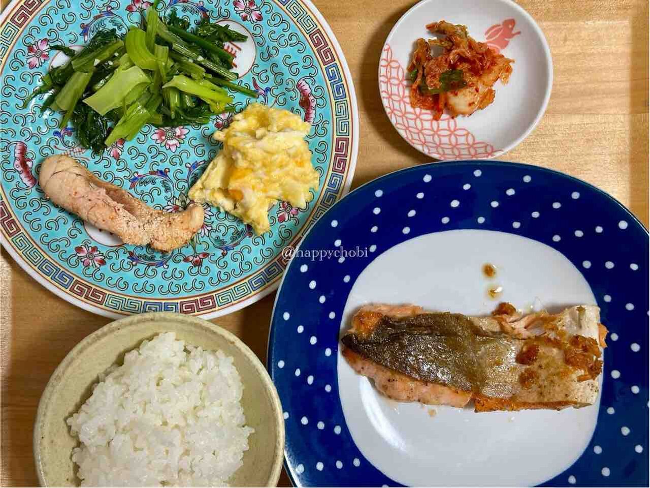 昨日の晩ごはん。野菜が少なかったので、キムチを追加して誤魔化す。