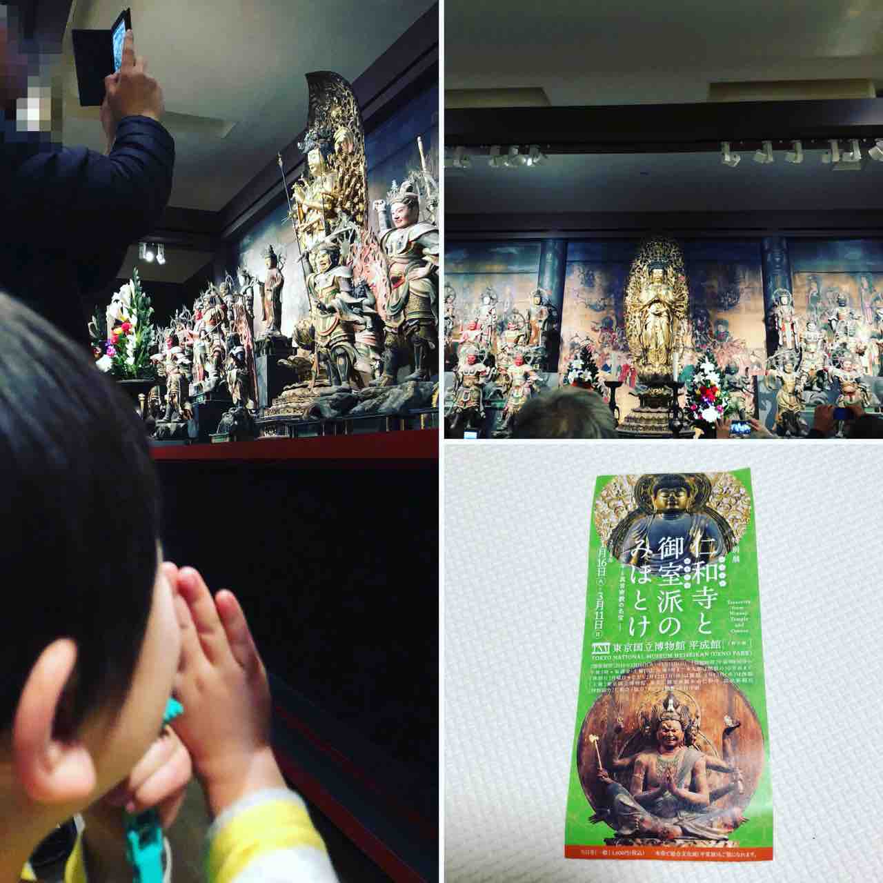 千手観音菩薩像を見にいってきました♪ 2018年02月23日 駅のポスターで千手観音菩薩を見てから、「ほら! て、いっぱいだよ!」「て、いっぱい、みたい!」と千手観音菩薩像に魅せられた息子。3歳にして仏像好き?!そんな息子を連れて、東京国立博物館に行ってきました♪見てきたのは、『仁和寺と御室派のみほとけ』展です。→ http://ninnaji2018.com/index.html感想は、、、「すごく良かった!!!!!」とにかく、仏像、仏像、仏像だらけ!!!!!曼荼羅や掛け軸や経典や仏具などいろいろあるのだけど、後半の仏像ぜめがすごい!!!!!こんなにたくさんの仏像、はじめて